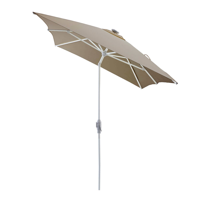Equipped with integrated LED lights, this parasol offers warm white illumination, lasting up to 8 hours when fully charged. With a UV protection rating of 50+, you can relax knowing you and your loved ones are well-shielded from the sun's rays. Raising the canopy is a breeze—simply turn the crank handle and watch your parasol come to life.